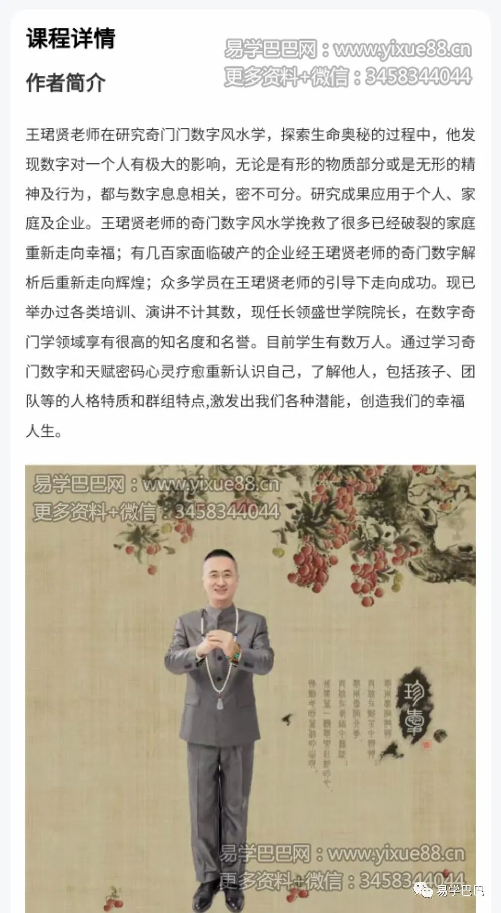 王珺贤老师研究奇门数字风水学,探索生命奥秘的过程中,他发现数字对一个人有极大的影响,无论是有形的物质部分或是无形的精神及行为,都与数字息息相关,密不可分。研究成果应用于个人、家庭及企业。王珺贤老师的奇门数字风水学挽救了很多已经破裂的家庭重新走向幸福;有几百家面临破产的企业经王珺贤老师的奇门数字解析后重新走向辉煌;众多学员在王珺贤老师的引导下走向成功。现已举办过各类培训、演讲不计其数,现任长领盛世学院院长,在数字奇门学领域享有很高的知名度和名誉。目前学生有数万人。通过学习奇门数字和天赋密码心灵疗愈重新认识自己,了解他人,包括孩子、团队等的人格特质和群组特点,激发出我们各种潜能,创造我们的幸福人生。