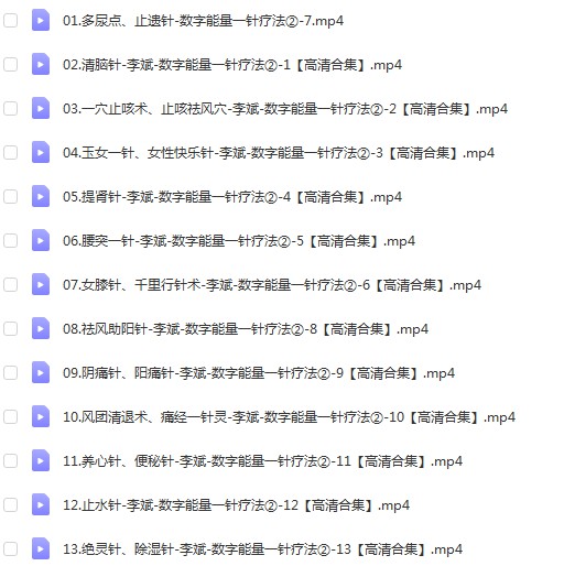 | ├──12.止水针-李斌-数字能量一针疗法②-12【高清合集】.mp4 339.02M
