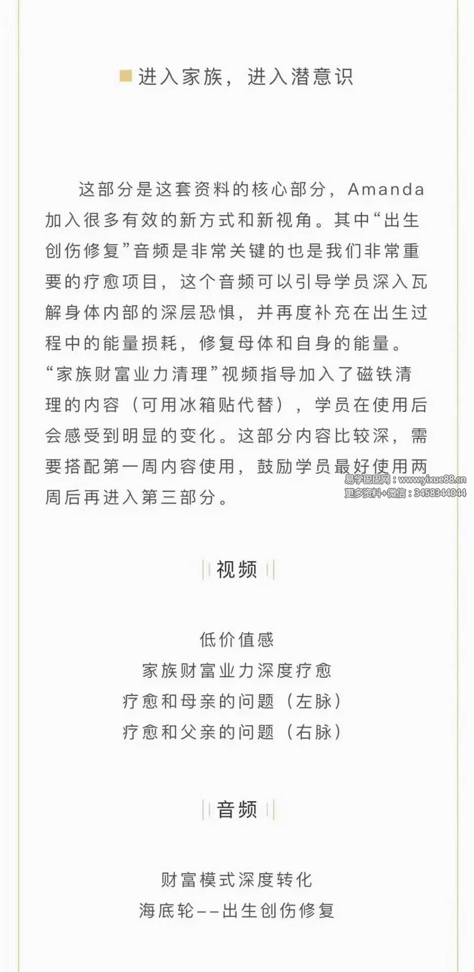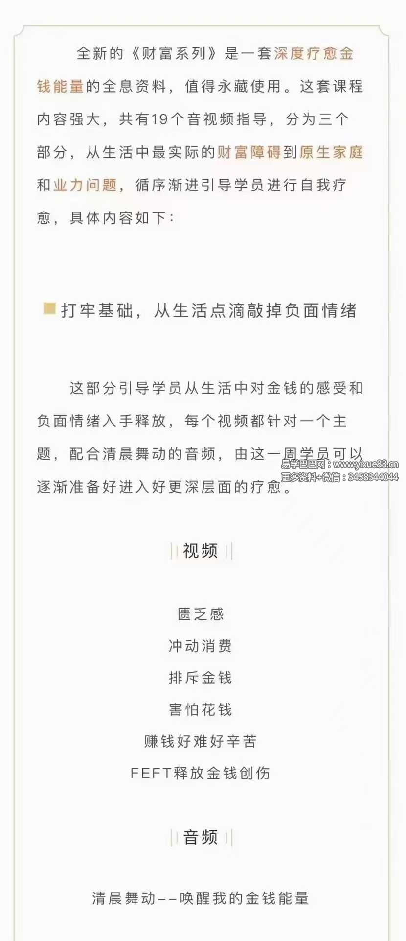 这套课程内容强大,共有19个音视频指导,分为三个部分,从生活中最实际的财富障碍到原生家庭和业力问题,循序渐进引导学员进行自我疗愈。