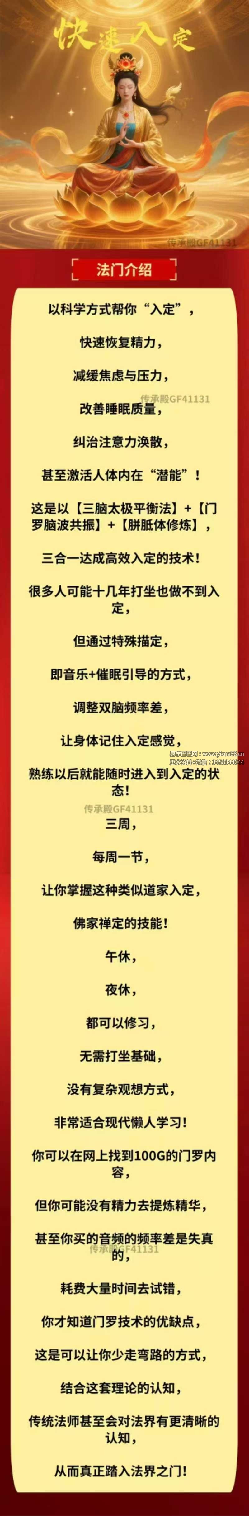 三合一达成高效入定的技术!很多人可能十几年打坐也做不到入定,但通过特殊描定,即音乐+催眠引导的方式,调整双脑频率差,让身体记住入定感觉,熟练以后就能随时进入到入定的状态!