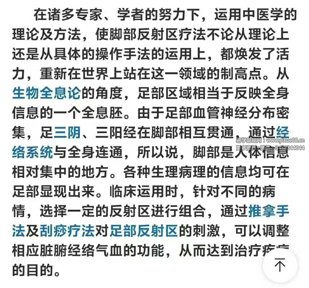 在诸多专家、学者的努力下,运用中医学的理论及方法,使脚部反射区疗法不论从理论上还是从具体的操作手法的运用上,都焕发了活力,重新在世界上站在这一领域的制高点。从生物全息论的角度,足部区域相当于反映全身信息的一个全息胚。由于足部血管神经分布密集,足三阴、三阳经在脚部相互贯通,通过经络系统与全身连通,所以说,脚部是人体信息相对集中的地方。各种生理病理的信息均可在足部显现出来。临床运用时,针对不同的病情,选择一定的反射区进行组合,通过推拿手法及刮痧疗法对足部反射区的刺激,可以调整相应脏腑经络气血的功能,从而达到治疗疾病的目的。