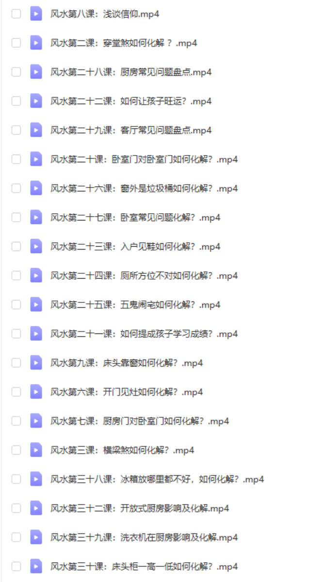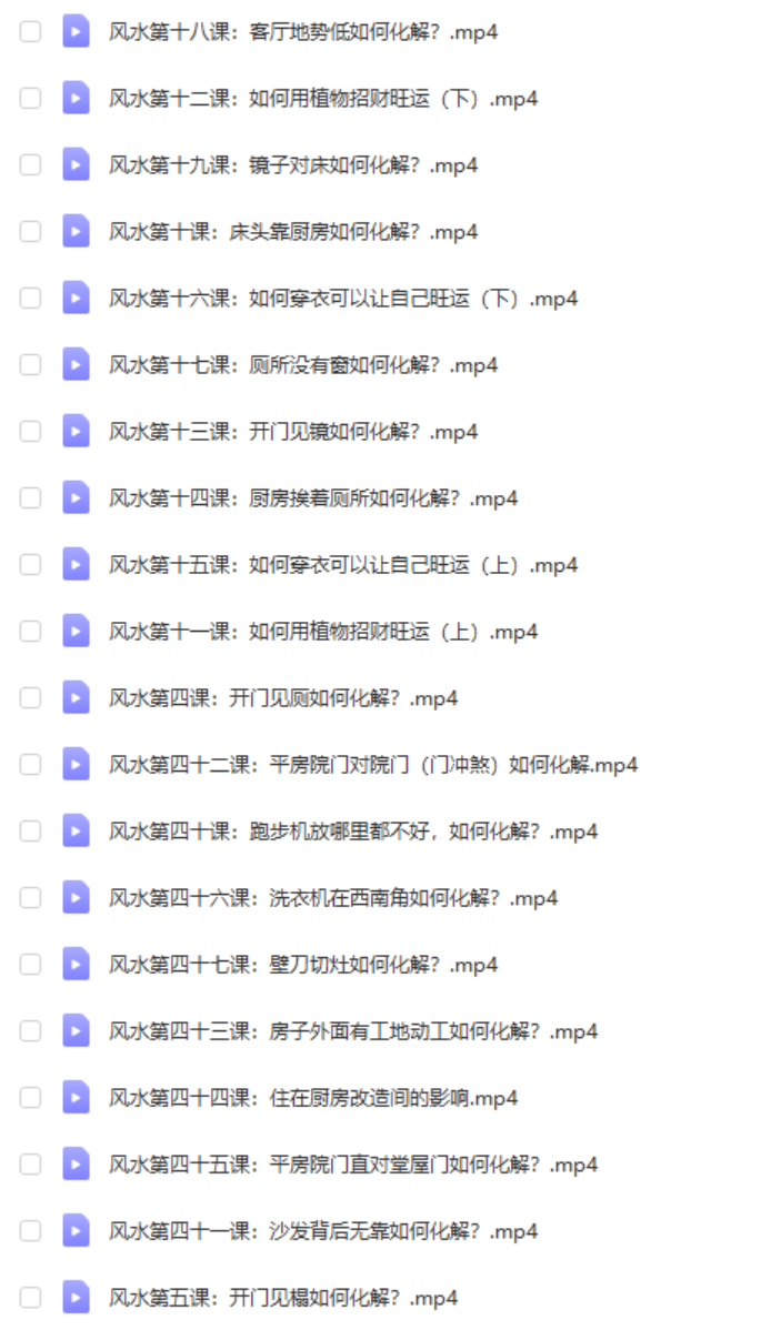 | ├──64、第六十四课:家里有这类物品,会让你破财损运.mp4 15.61M
