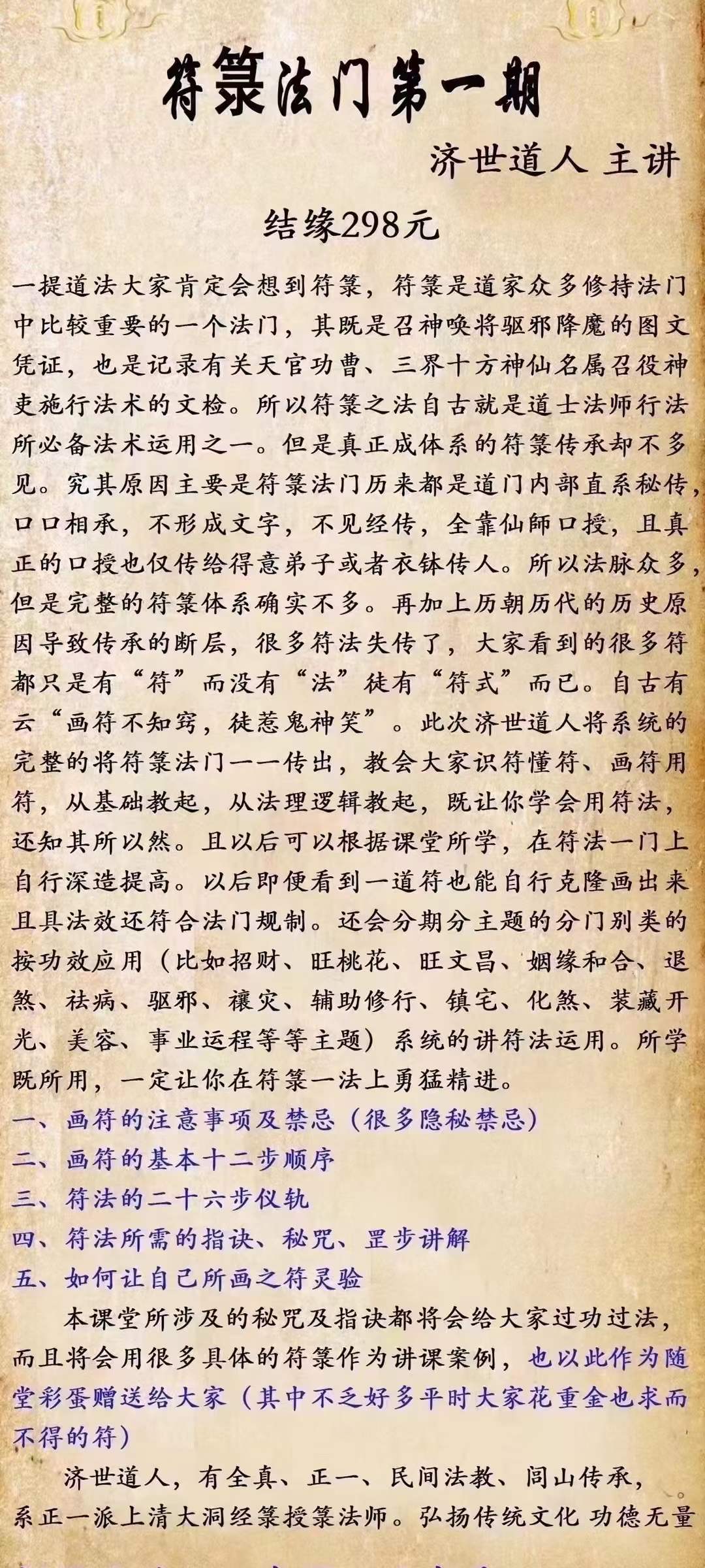 一提道法大家肯定会想到符篆,符篆是道家众多修持法门中比较重要的一个法门,其既是召神唤将驱邪降魔的图文凭证,也是记录有关天官功曹、三界十方神仙名属召役神吏施行法术的文检。所以符之法自古就是道士法师行法所必备法术运用之一。但是真正成体系的符篆传承却不多见。究其原因主要是符篆法门历来都是道门内部直系秘传,口口相承,不形成文字,不见经传,全靠仙師口授,且真正的口授也仅传给得意弟子或者衣钵传人。所以法脉众多,但是完整的符篆体系确实不多。再加上历朝历代的历史原因导致传承的断层,很多符法失传了,大家看到的很多符都只是有“符”而没有“法”徒有“符式”而已。自古有云“画符不知窍,徒惹鬼神笑”。此次济世道人将系统的完整的将符篆法门一一传出,教会大家识符懂符、画符用符,从基础教起,从法理逻辑教起,既让你学会用符法,还知其所以然。且以后可以根据课堂所学,在符法一门上自行深造提高。以后即便看到一道符也能自行克隆画出来且具法效还符合法门规制。还会分期分主题的分门别类的按功效应用(比如招财、旺桃花、旺文昌、姻缘和合、退煞、祛病、驱邪、禳灾、辅助修行、镇宅、化煞、装藏开光、美容、事业运程等等主题)系统的讲符法运用。所学既所用,一定让你在符篆一法上勇猛精进。