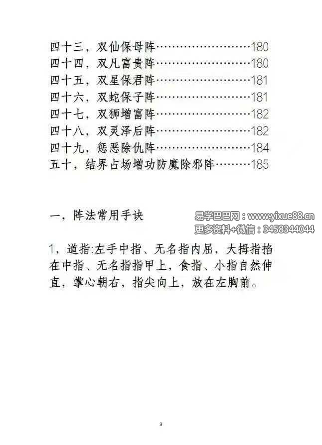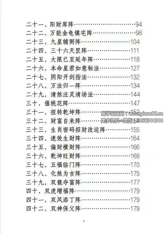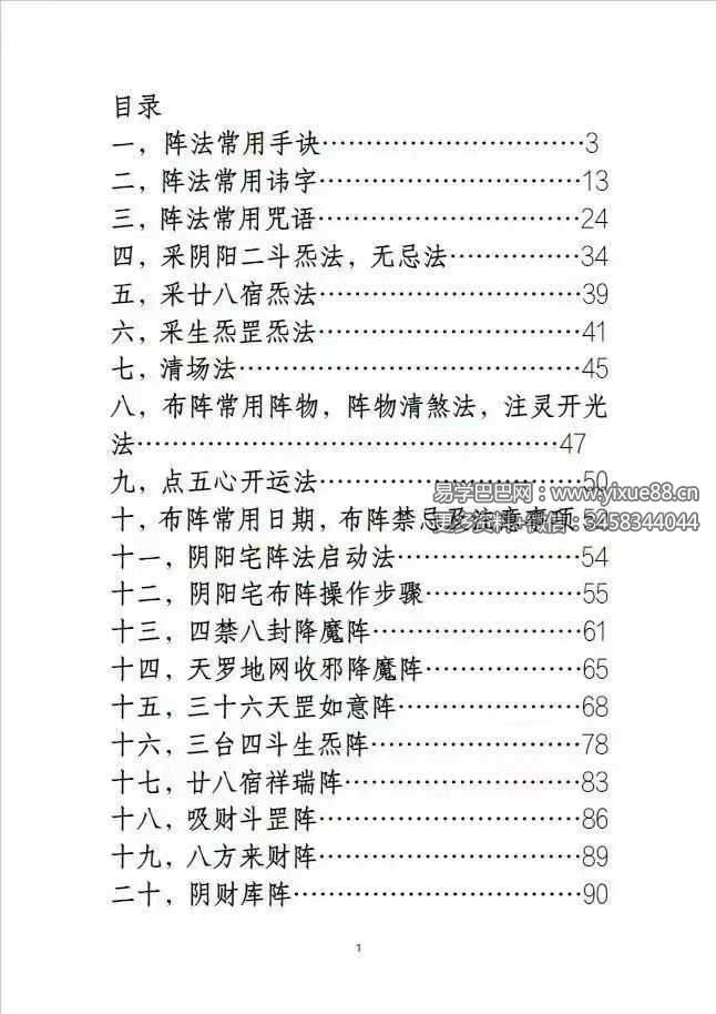 有阵法常用手诀,讳字,咒语,彩阴阳二斗炁法,无忌法,清场法,布阵常用阵物,清煞法,注灵开光法,布阵日期,禁忌及注意事项,阴阳宅阵法启动法,操作步骤,四禁八封降魔阵,三十六天罡如意阵,廿八宿祥瑞阵,吸财斗罡阵,八方来财阵,阴阳财库阵,九星辅弼阵,大限已至延年阵,本命星君如意秘法,万法归一阵,催桃花阵,财富自来阵,五福临门阵,化煞为吉阵,双龙夺富阵,双凤添丁阵,双神保父阵,双仙保母阵,双蛇保子阵,双灵泽后阵,惩恶除仇阵个…等等