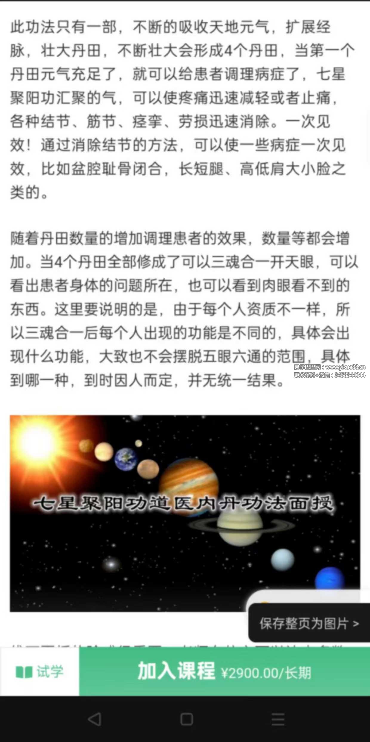此功法只有一部,不断的吸收天地元气,扩展经脉,壮大丹田,不断壮大会形成4个丹田,当第一个丹田元气充足了,就可以给患者调理病症了,七星聚阳功汇聚的气,可以使疼痛迅速减轻或者止痛,各种结节、筋节、痉挛、劳损迅速消除。一次见效!通过消除结节的方法,可以使一些病症一次见效,比如盆腔耻骨闭合,长短腿、高低肩大小脸之类的。
