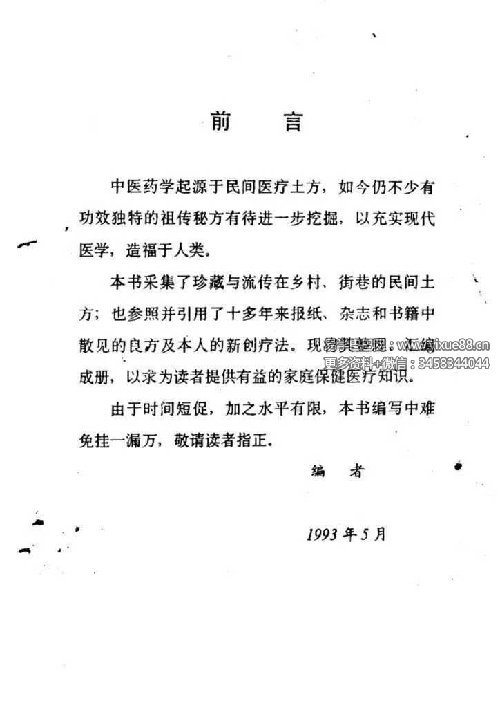🆕简介:《民间医疗土方》陈北平编著,中医方书相关古籍。本书采集了珍藏与流传在乡村、街巷的民间土方;也参照并引用了十多年来报纸、杂志和书籍中散见的良方及本人的新创疗法。现将其整理、汇编成册,以求为读者提供有益的家庭保健医疗知识